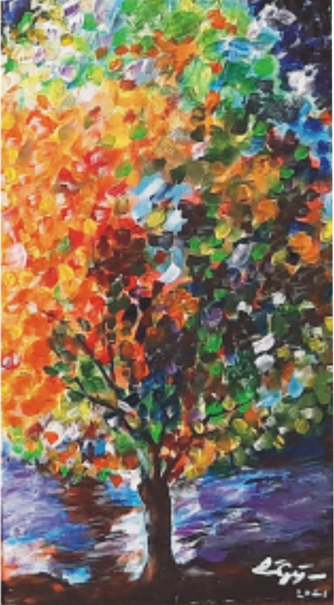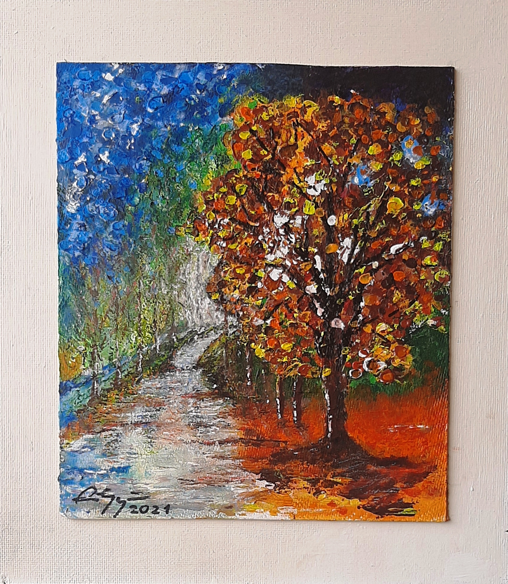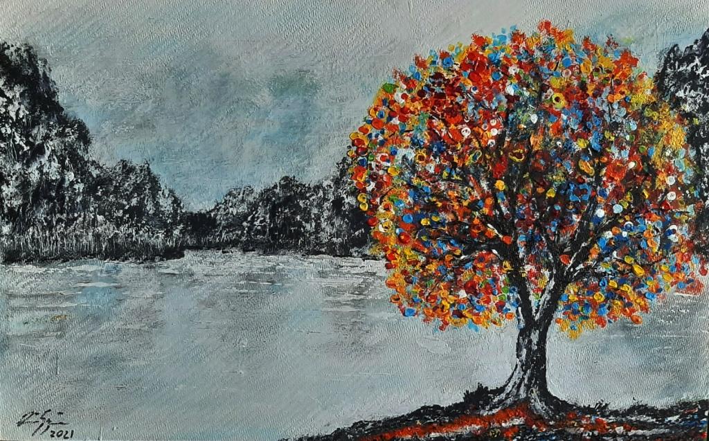 Színes fa a parton.                                                      2021 Nőnap                                  rdős táj